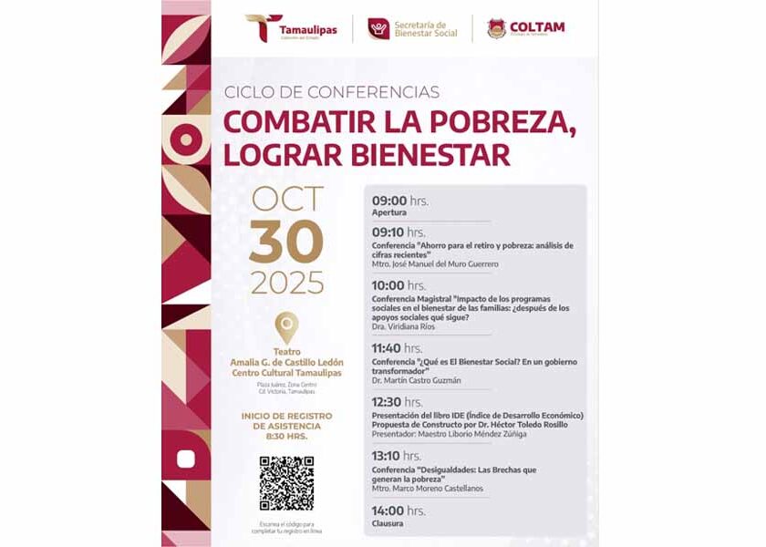 Ciudad Victoria, Tamaulipas.- El Gobierno del Estado a través de la Secretaría de Bienestar Social y el Colegio de Tamaulipas, organizan el ciclo de conferencias “Combatir la Pobreza, Lograr Bienestar”, que se desarrollará el 31 de octubre en el Teatro Amalia G. de Castillo Ledón, a partir de las 9:00 horas. Silvia Casas González, secretaria de Bienestar Social, informó que…