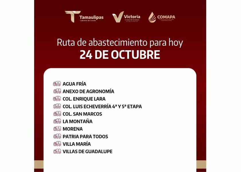 En COMAPA Victoria trabajamos para que el agua llegue a cada rincón de la ciudad. Este día, el servicio de abastecimiento se realiza en: