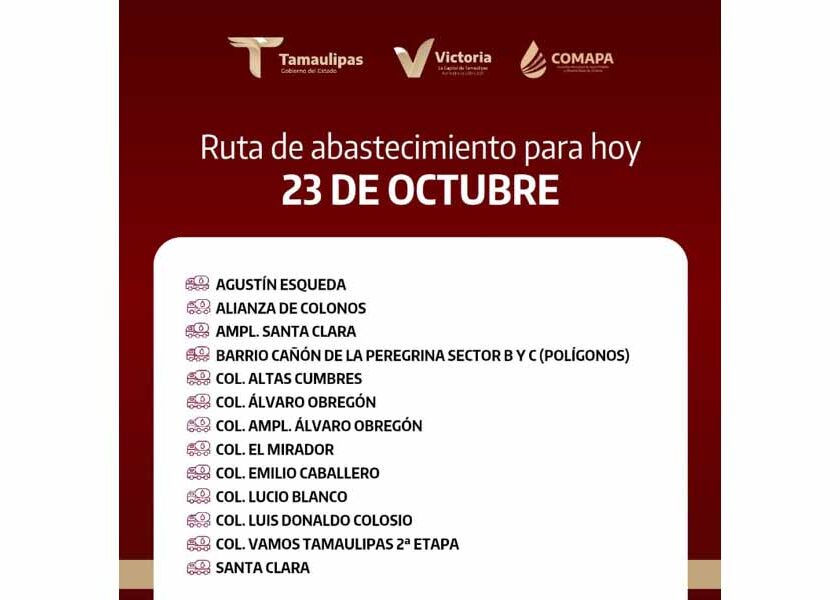 En COMAPA Victoria trabajamos para que el agua llegue a cada rincón de la ciudad. Este día, el servicio de abastecimiento se realiza en: