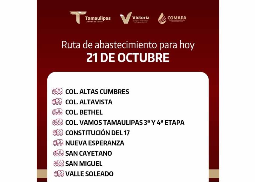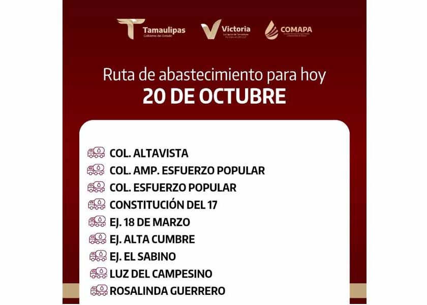 En COMAPA Victoria trabajamos para que el agua llegue a cada rincón de la ciudad. Este día, el servicio de abastecimiento se realiza en: