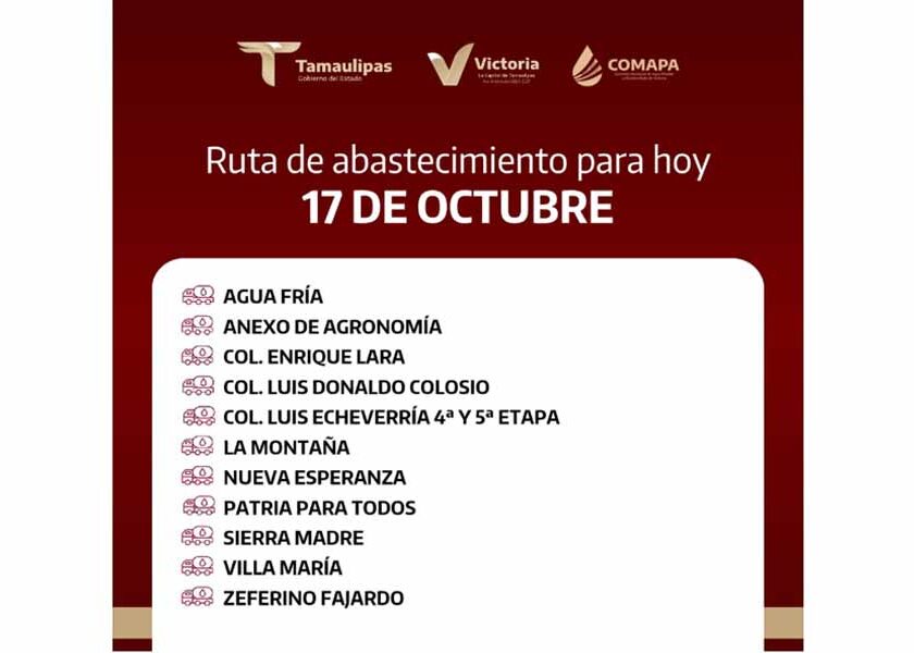 En COMAPA Victoria trabajamos para que el agua llegue a cada rincón de la ciudad. Este día, el servicio de abastecimiento se realiza en: