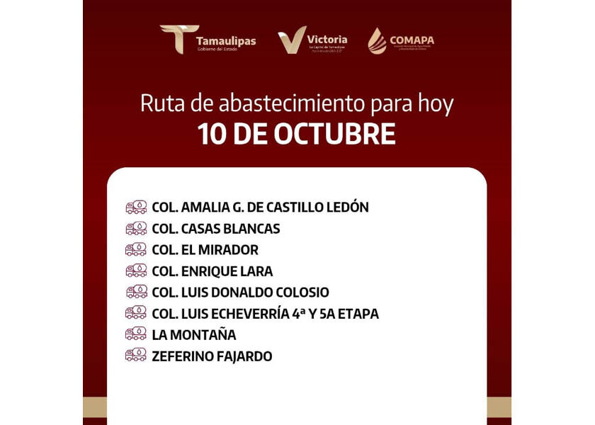 En COMAPA Victoria trabajamos para que el agua llegue a cada rincón de la ciudad. Este día, el servicio de abastecimiento se realiza en:
