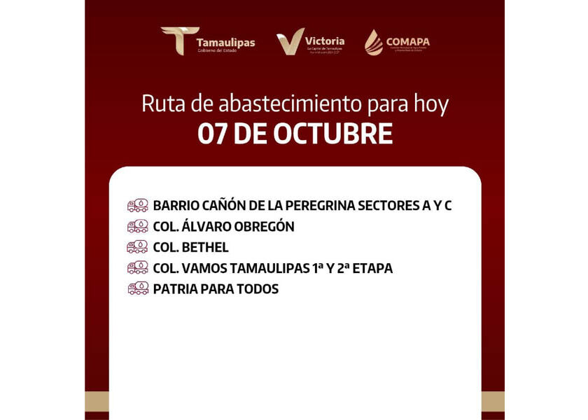 En COMAPA Victoria trabajamos para que el agua llegue a cada rincón de la ciudad. Este día, el servicio de abastecimiento se realiza en: