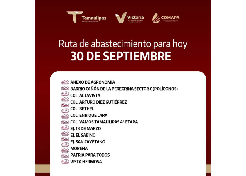📍Anexo de Agronomía📍Barrio Cañón de la Peregrina Sector C (Polígonos)📍Col. Altavista📍Col. Arturo Diez Gutiérrez📍Col. BethelCol. Enrique Lara📍Col. Vamos Tamaulipas 4ª Etapa📍Ej. 18 de Marzo📍Ej. El Sabino📍Ej. San Cayetano📍Morena📍Patria para Todos📍Vista Hermosa 💧 ¡Juntos hacemos que el agua llegue a todos! Comparte esta información con tus vecinos.