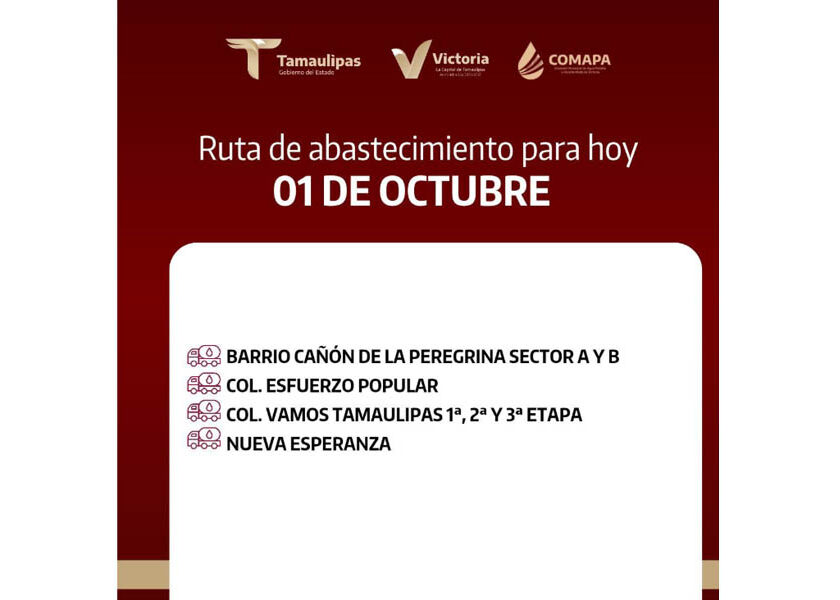 En COMAPA Victoria trabajamos para que el agua llegue a cada rincón de la ciudad. Este día, el servicio de abastecimiento se realiza en: