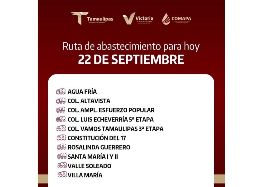 📍Agua Fría📍Col. Altavista📍Col. Ampl. Esfuerzo Popular📍Col. Luis Echeverría 5ª Etapa📍Col. Vamos Tamaulipas 3ª Etapa📍Constitución del 17📍Rosalinda Guerrero📍Santa María I y II📍Valle Soleado📍Villa María 💧 ¡Juntos hacemos que el agua llegue a todos! Comparte esta información con tus vecinos.
