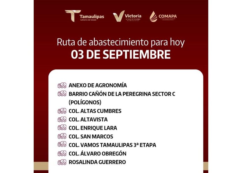 En COMAPA Victoria trabajamos para que el agua llegue a cada rincón de la ciudad. Este día, el servicio de abastecimiento se realiza en: