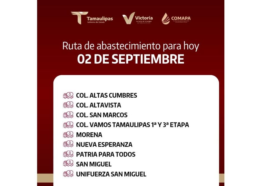 En COMAPA Victoria trabajamos para que el agua llegue a cada rincón de la ciudad. Este día, el servicio de abastecimiento se realiza en: