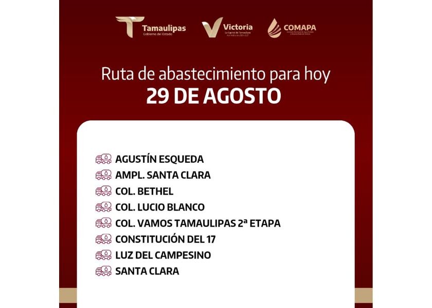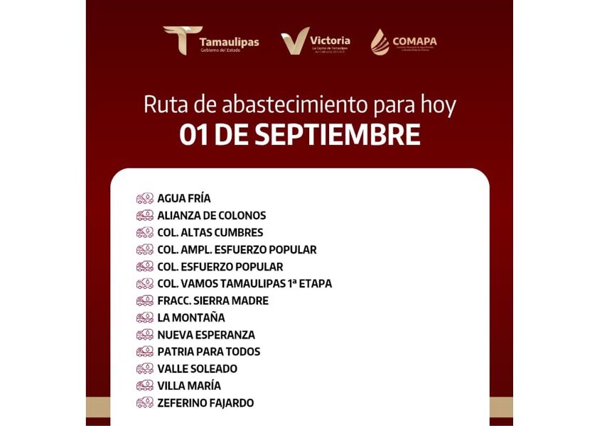 En COMAPA Victoria trabajamos para que el agua llegue a cada rincón de la ciudad. Este día, el servicio de abastecimiento se realiza en: