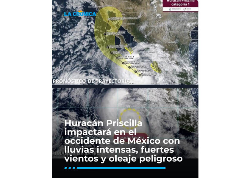 EL huracán Priscilla, de categoría 1, se acerca al occidente de México y traerá consigo lluvias intensas, vientos fuertes y oleaje peligroso. El Servicio Meteorológico Nacional informó que su centro se localiza al suroeste de Cabo Corrientes, Jalisco, con vientos de hasta 170 km/h. SE esperan lluvias intensas en Colima y Jalisco, muy fuertes en Baja California Sur, Sinaloa, Nayarit,…