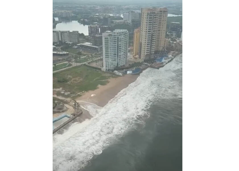 Marea alta que cubre casi la totalidad de las áreas de bañistas en la playa de Mazatlán
