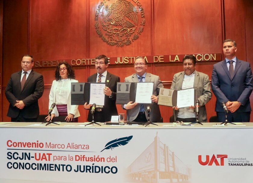 Ciudad de México.- La Universidad Autónoma de Tamaulipas (UAT) y la Suprema Corte de Justicia de la Nación (SCJN) suscribieron el Convenio Marco Alianza SCJN–UAT para la Difusión del Conocimiento Jurídico, así como un convenio específico en materia de servicio social. El acto fue encabezado por el rector de la UAT, Dámaso Anaya Alvarado, y por el secretario general de…