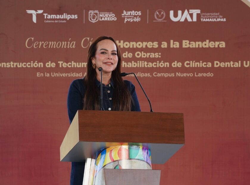 Nuevo Laredo, Tam.- El rector de la Universidad Autónoma de Tamaulipas (UAT), Dámaso Anaya Alvarado, encabezó, junto a la presidenta municipal de Nuevo Laredo, Carmen Lilia Canturosas Villarreal, la ceremonia cívica de honores a la bandera y la entrega de la nueva techumbre en la Facultad de Comercio, Administración y Ciencias Sociales de Nuevo Laredo. La ceremonia, realizada este 29…