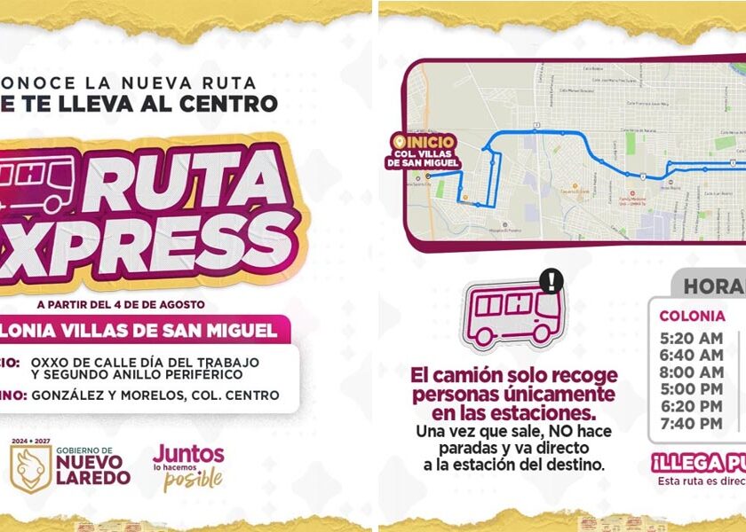 Nuevo Laredo, Tam.- El Gobierno Municipal de Nuevo Laredo, encabezado por la presidenta Carmen Lilia Canturosas Villarreal en coordinación con el Gobierno del Estado ponen en marcha a partir de este lunes 4 de agosto dos nuevas rutas exprés de transporte público, con el objetivo de mejorar la movilidad urbana y brindar un servicio más rápido, eficiente y directo a…