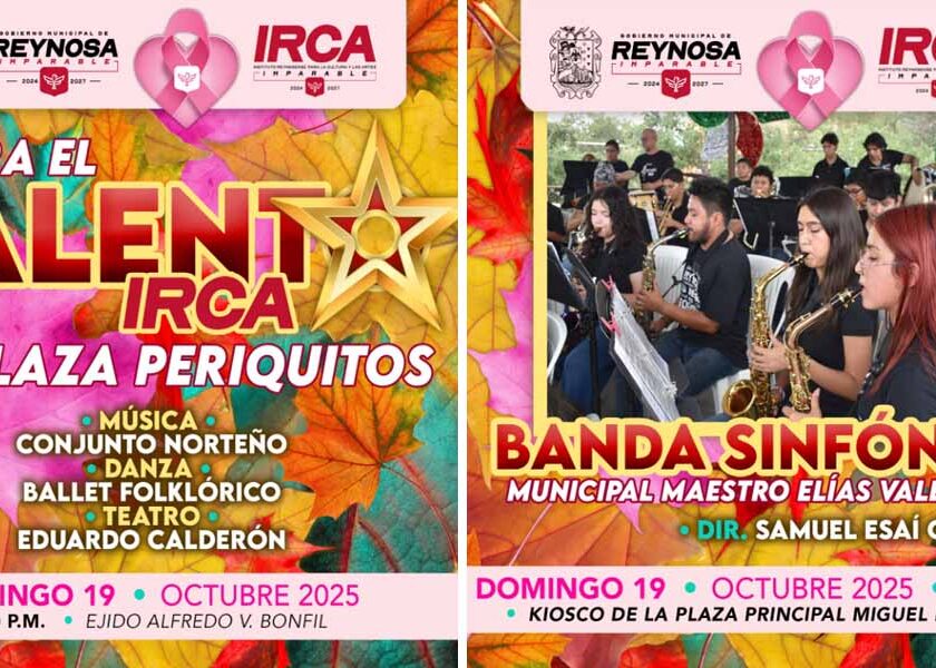 Reynosa, Tam.- Siguiendo las instrucciones del Alcalde Carlos Peña Ortiz, el Instituto Reynosense para la Cultura y las Artes invita a la comunidad a disfrutar de los eventos artísticos gratuitos que se llevarán a cabo este domingo 19 de octubre. A las 4:00 P. M., en la plaza Periquitos del ejido Alfredo Bonfil, se presentarán integrantes del Talento IRCA con…