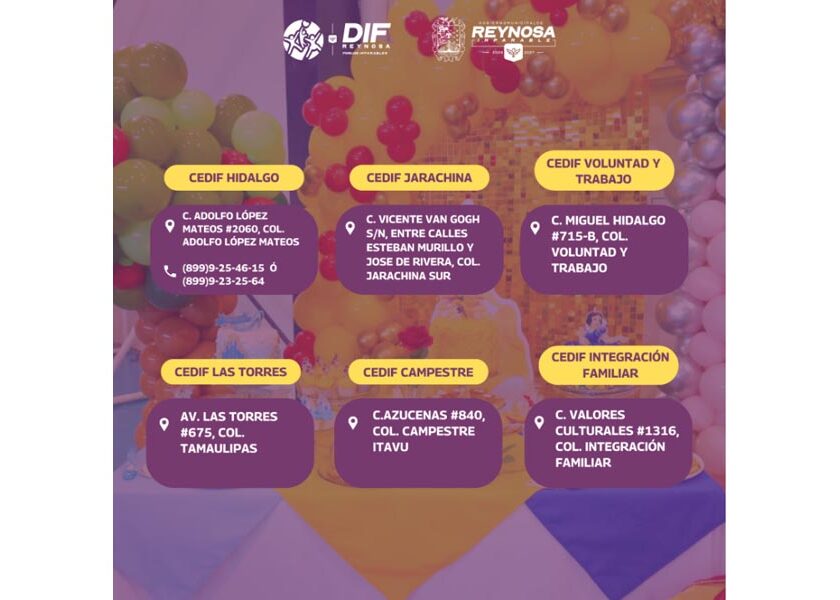 Reynosa, Tam.- El Sistema DIF-Reynosa que preside Carlos Luis Peña Garza, mantiene abiertas las inscripciones para los diversos talleres CEDIF, una alternativa de formación y capacitación dirigida a la comunidad con el propósito de impulsar el desarrollo personal y económico de las familias. Los talleres disponibles incluyen Técnico Terapeuta, Técnicas Moldeantes, Auxiliar de Enfermería, Cuidados Asistenciales, Belleza, Alto Peinado, Uñas,…