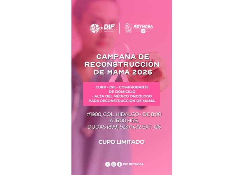 Reynosa, Tam.- El Sistema DIF-Reynosa que preside Carlos Luis Peña Garza, invita a las mujeres que han vencido el cáncer de mama a inscribirse en la Campaña de Reconstrucción de Mama 2026, con el objetivo de contribuir al bienestar, fortalecer la confianza y mejorar la calidad de vida. Las interesadas deberán acudir a las oficinas del DIF central, ubicadas en…