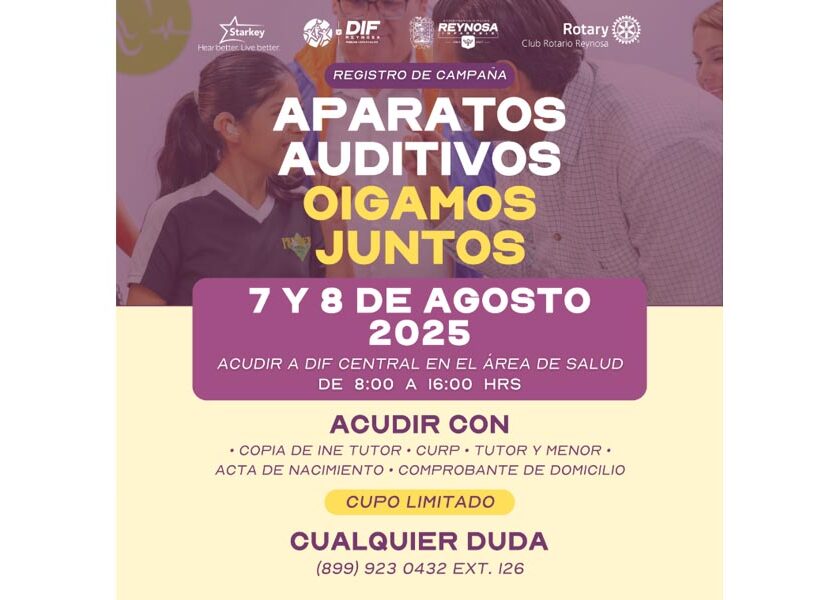 Reynosa, Tam.- Gracias al compromiso del Alcalde, Carlos Peña Ortiz, con el bienestar de las familias reynosenses, el Sistema DIF-Reynosa que preside Carlos Luis Peña Garza, en coordinación con el Club Rotary y la Fundación Starkey, invita a la ciudadanía a participar en la campaña “¡Oigamos Juntos!”, que busca apoyar a niñas, niños y adolescentes con algún grado de hipoacusia,…