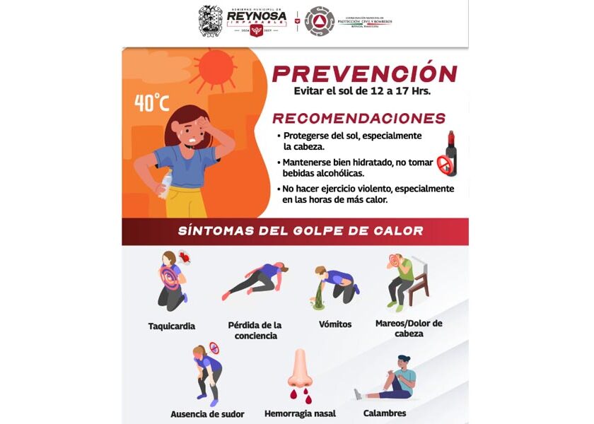 Reynosa, Tam.- El Gobierno que preside el Alcalde Carlos Peña Ortiz te invita a tomas medidas para evitar la insolación, conocida también como golpe de calor, que puede identificarse a tiempo con sus síntomas principales. La taquicardia, pérdida de la conciencia, mareo, dolor de cabeza y vómito, además de ausencia de sudor, hemorragia nasal y calambres, son las características que…