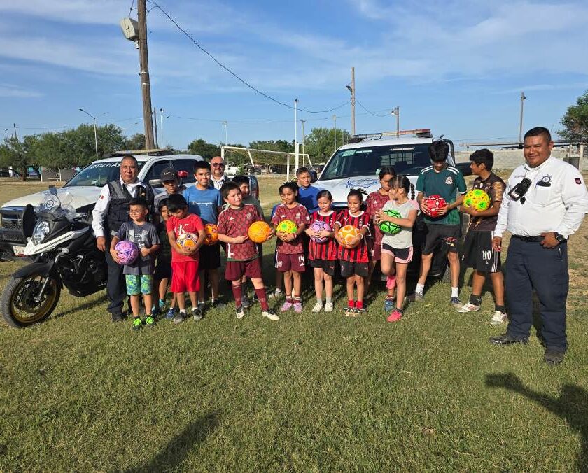 Reynosa, Tam.- Elementos de la Secretaría de Seguridad Pública, Tránsito y Vialidad Municipal, respaldando la política del Alcalde Carlos Peña Ortiz, en el fomentar a la juventud en el deporte, donaron balones a niños y niñas que juegan en las canchas de la colonia Almaguer. Los agentes de vialidad visitaron a los jóvenes deportistas en los Campos Kary, donde los…