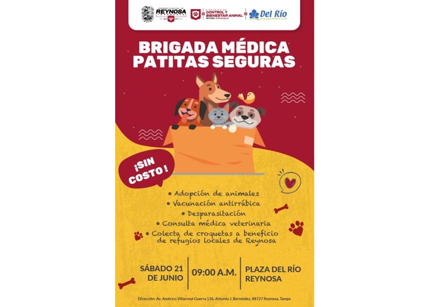 Reynosa, Tam.- La Brigada Patitas Seguras, que impulsa el Presidente Municipal Carlos Peña Ortiz, ofrece servicios médicos veterinarios gratuitos y se llevará a cabo en la plaza comercial Del Río este sábado 21 de junio a partir de las 9:00 de la mañana. Estarán disponibles de forma gratuita servicios de vacunación antirrábica y desparasitación, además contará con animales para adopción;…