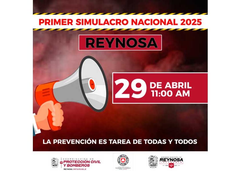 Reynosa, Tam.- La Coordinación de Protección Civil y Bomberos de Reynosa informa a la ciudadanía que este martes 29 de abril se llevará a cabo el Primer Simulacro Nacional 2025, bajo la hipótesis de un sismo de magnitud 8.1. En esta ciudad, el ejercicio se desarrollará en coordinación con el Hospital General de Reynosa, el Instituto Mexicano del Seguro Social,…