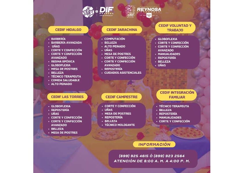 Reynosa, Tam.- Con apoyo del Alcalde, Carlos Peña Ortiz, el Sistema DIF-Reynosa que preside Carlos Luis Peña Garza, continúa ampliando las oportunidades de capacitación para la población, a través de los Centros para el Desarrollo Integral de la Familia, donde se imparten talleres orientados al autoempleo y al desarrollo personal, en beneficio de mujeres y hombres de distintos sectores de…