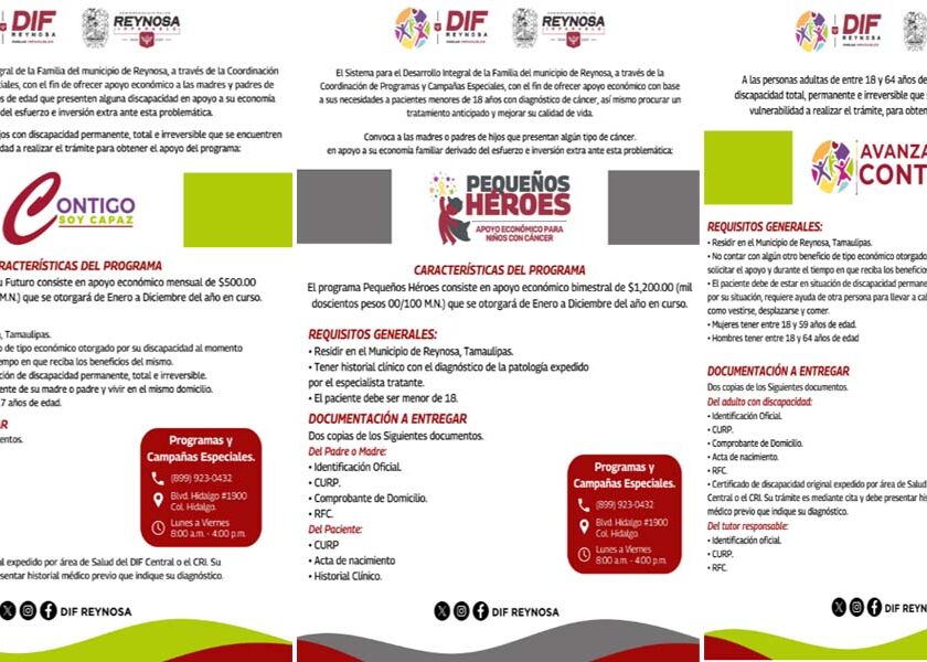 Reynosa, Tam.- El Sistema DIF-Reynosa que preside Carlos Luis Peña Garza, dio inicio al registro de nuevo ingreso para las becas Avanzando Contigo, Apoyando Tu Futuro, Contigo Soy Capaz y Pequeños Héroes. Este programa es dirigido a menores de edad y adultos con discapacidad, niñas y niños con cáncer, así como a hijas e hijos de internos en CEDES, con…