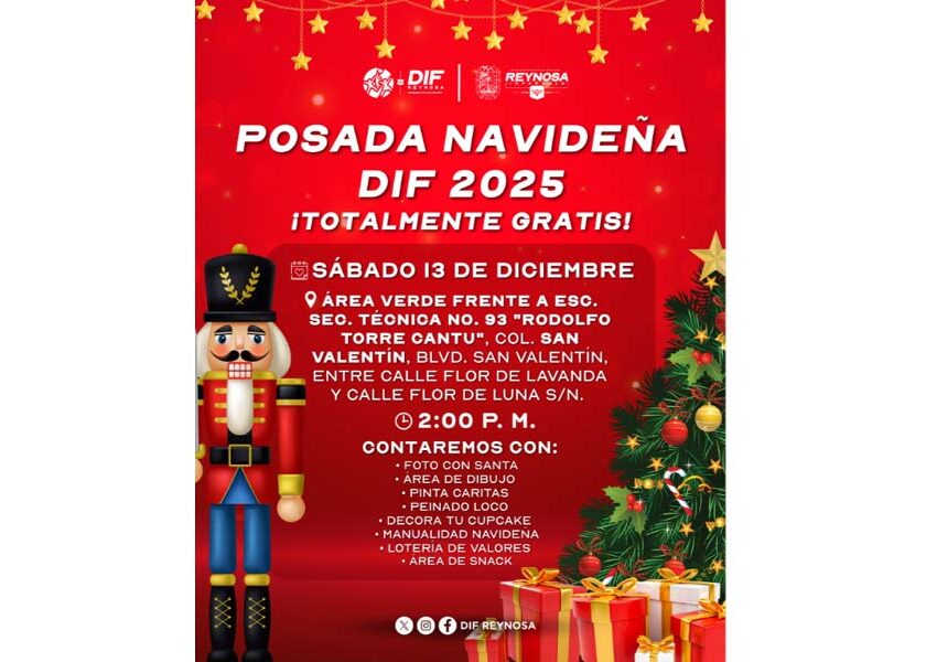 Reynosa, Tam.- El Sistema DIF Reynosa que preside Carlos Luis Peña Garza llevará a cabo la Posada Navideña DIF 2025 hoy sábado 13 de diciembre, a partir de las 2:00 de la tarde, en el área verde frente a la Escuela Secundaria Técnica No. 93 “Rodolfo Torre Cantú”, ubicada en la colonia San Valentín. Esta actividad forma parte de las…