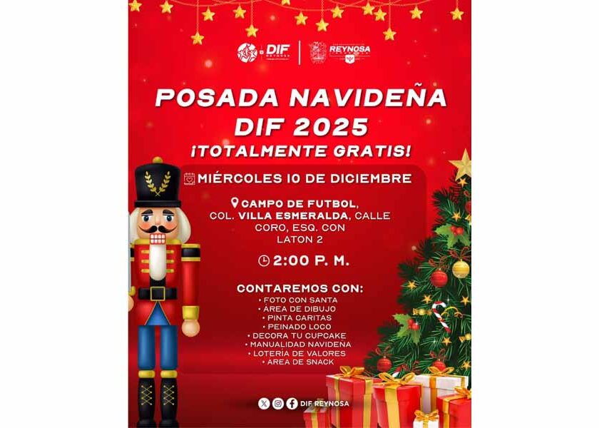 Reynosa, Tam.- El Sistema DIF-Reynosa por instrucciones del Alcalde Carlos Peña Ortiz, invita a todas las familias de la Colonia Loma Real a disfrutar de la Posada Navideña DIF 2025, una celebración completamente gratuita que llegará este martes 9 de diciembre al campo de futbol de la zona, ubicado en Calle Palma Real, entre Calle Suecia y Calle Tailandia. La…