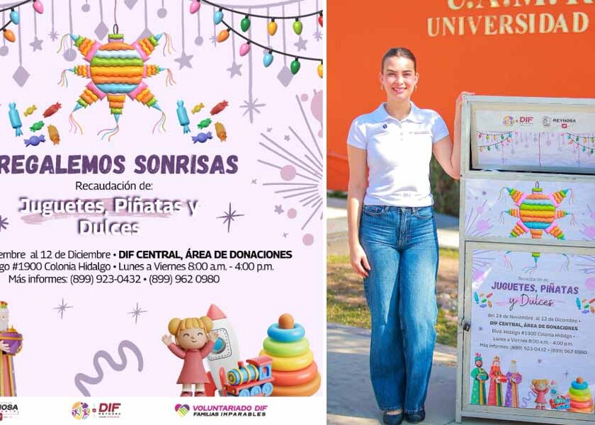 Reynosa, Tam.- El Sistema DIF-Reynosa que preside Carlos Luis Peña Garza, a través del Voluntariado que encabeza Alejandra Yelitza Garza, invita a la ciudadanía a sumarse a la campaña Regalemos Sonrisas, una iniciativa solidaria de recaudación de juguetes, piñatas y dulces, con el fin de llevar alegría en esta temporada decembrina. La campaña permanecerá hasta el 12 de diciembre en…