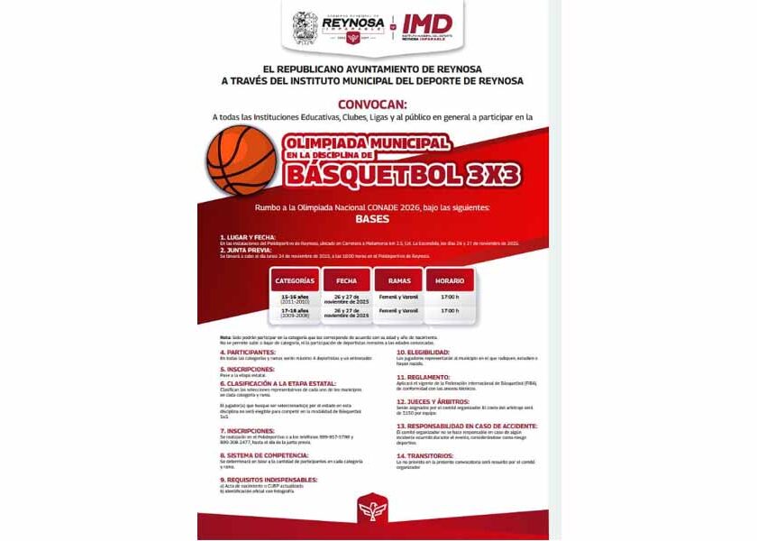 Reynosa, Tam.- El Alcalde Carlos Peña Ortiz invita a todas las instituciones educativas, clubes, ligas y al público en general a participar en la Olimpiada Municipal en la disciplina de Basquetbol 3×3, rumbo a la Olimpiada Nacional CONADE 2026, con el objetivo de impulsar el talento deportivo local. El Instituto Municipal del Deporte, lanzó la convocatoria oficial para este torneo,…