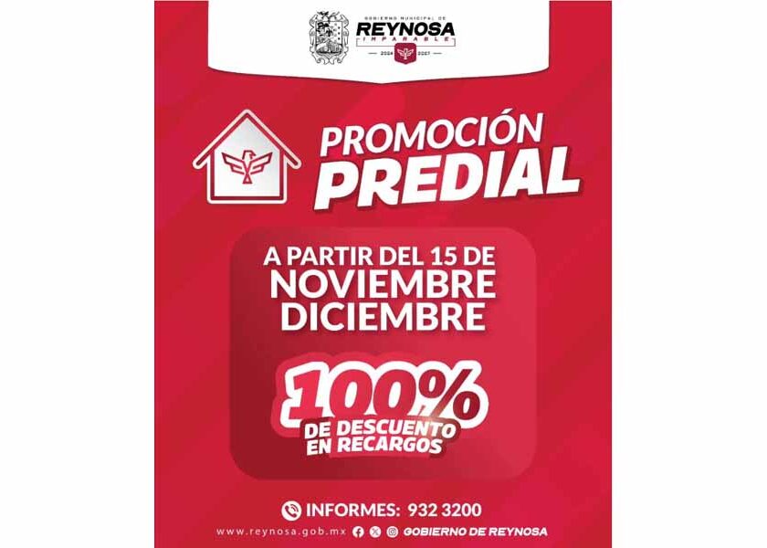 Reynosa, Tam.- El Gobierno del Presidente Carlos Peña Ortiz ofrece la promoción en el Impuesto Predial, del 100% de condonación de recargos durante noviembre y diciembre, descuento que puede ser obtenido en las cajas de Finanzas y Tesorería, oficinas foráneas de COMAPA, cajeros automáticos del Ayuntamiento y página web del Municipio. Esta es una oportunidad para que los propietarios de…