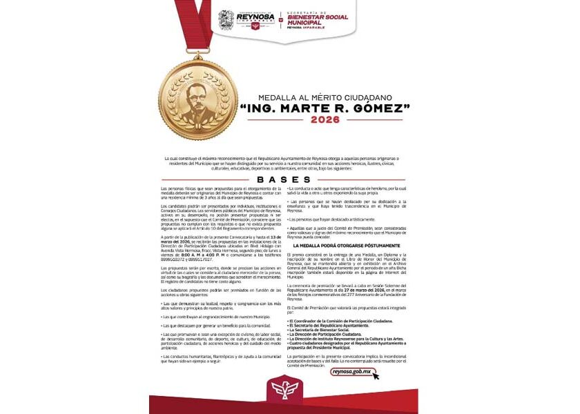 Reynosa, Tam.- El Alcalde Carlos Peña Ortiz hace una invitación a la sociedad reynosense a la Convocatoria Medalla al Mérito Ciudadano “Ing. Marte R. Gómez” 2026, dirigida a aquellas personas originarias o residentes del Municipio que se hayan distinguido por su servicio a nuestra comunidad en sus acciones heroicas, ilustres, cívicas, culturales, educativas, deportivas o ambientales. Las propuestas serán recibidas…