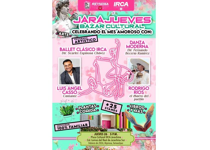 Reynosa, Tam.- El Gobierno de Reynosa, que preside el Alcalde Carlos Peña Ortiz, invita a la comunidad a disfrutar este jueves 26 de febrero del tradicional Jarajueves, que se llevará a cabo en la Plaza Cultural IRCA Jarachina a las 5:00 P. M. Se contará con la participación de más de 25 stands que ofrecerán arte, plantas, gastronomía y libros,…
