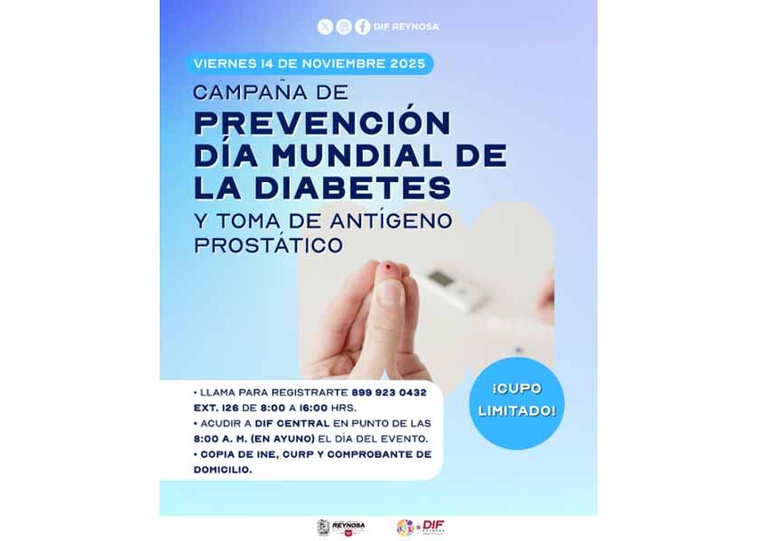 Reynosa, Tam.- El Sistema DIF-Reynosa, que preside Carlos Luis Peña Garza, invita a la ciudadanía a participar en la Campaña de Prevención “Día Mundial de la Diabetes” y Toma de Antígeno Prostático, que se llevará a cabo el viernes 14 de noviembre en las instalaciones del DIF Central ubicadas en bulevar Hidalgo número 1900 en la colonia Hidalgo, a partir…