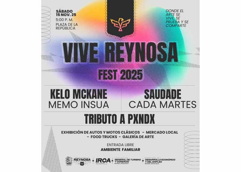 Reynosa, Tam.- Por instrucciones del Alcalde Carlos Peña Ortiz, el Instituto Reynosense para la Cultura y las Artes presenta este sábado 15 de noviembre el Vive Reynosa Fest 2025 en la Plaza de la República a las 5:00 P. M. La entrada al festival es libre y contará con la actuación musical de Kelo McKane, Memo Insua, Saudade, Cada Martes…